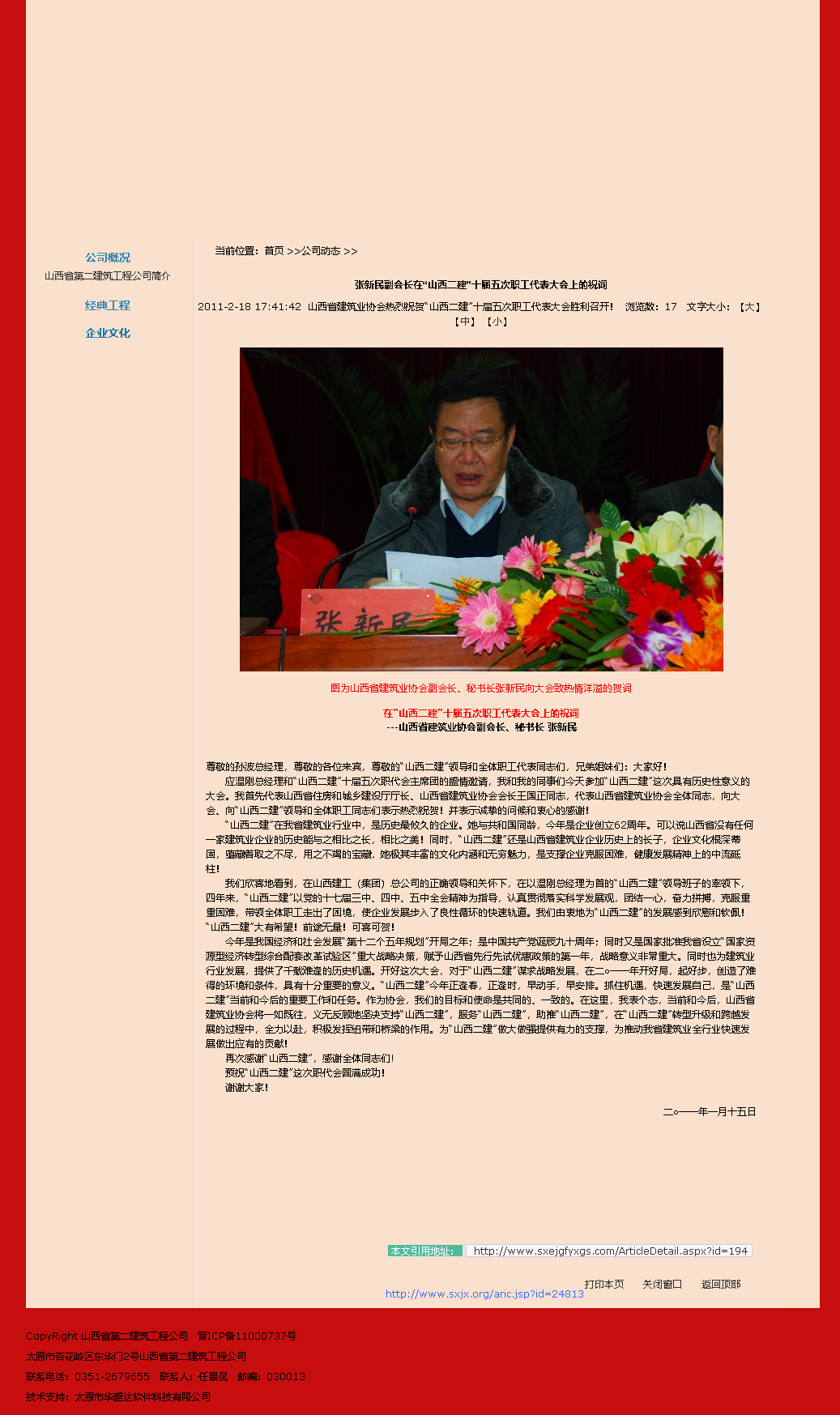 今天之所以把山西二建集團有限公司的奠基人和他的事跡發(fā)布,就是要在恰當?shù)臅r間和空間交匯點,金龍?zhí)ь^騰飛時刻,把山西二建再一次推上一個嶄新的發(fā)展階段——造就一個英雄的、光榮的、強大的百年山西二建!