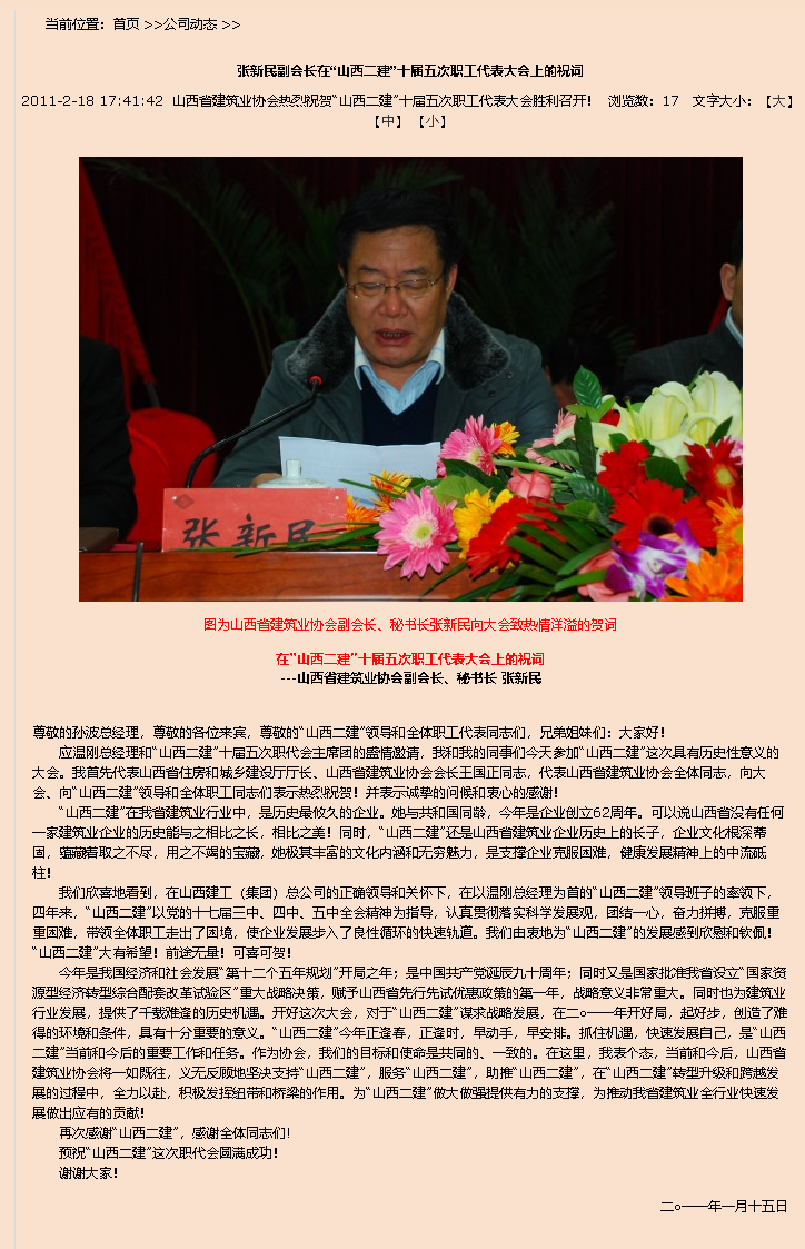 “山西二建”未來的發(fā)展,未來的前景強大!我可以告訴同志們:也是必然結(jié)果!我們今天參會的正式代表也罷,列席代表也罷,我在黨政聯(lián)席會議上,給領(lǐng)導同志們講的一點,個別領(lǐng)導同志們也講,我說經(jīng)過未來三到五年的奮斗,我們要達成這樣一個目標,給二公司裝上一雙翅膀,讓二公司或者“山西二建”想往哪飛,就往哪飛!想飛多高,就飛多高!想飛多遠,就飛多遠!這就是我們“十二五規(guī)劃”的目標!這就是我們“十二五”訴求的東西!而且我前天已經(jīng)講了,那個時候的到來,同樣是我們“山西二建”的必然結(jié)果!所以前兩天同樣給同志們講,2011年的職代會絕對非比尋常!2011年的職代會絕對不比前幾年的職代會!她對二公司未來幾年甚至更多年的預示非常!意義非常!必將會對未來幾年或更多年的實際成果,發(fā)展成果印證!今天我們所訴求的!今天我們規(guī)劃的!今天我們?yōu)橹冻龅臓奚模?