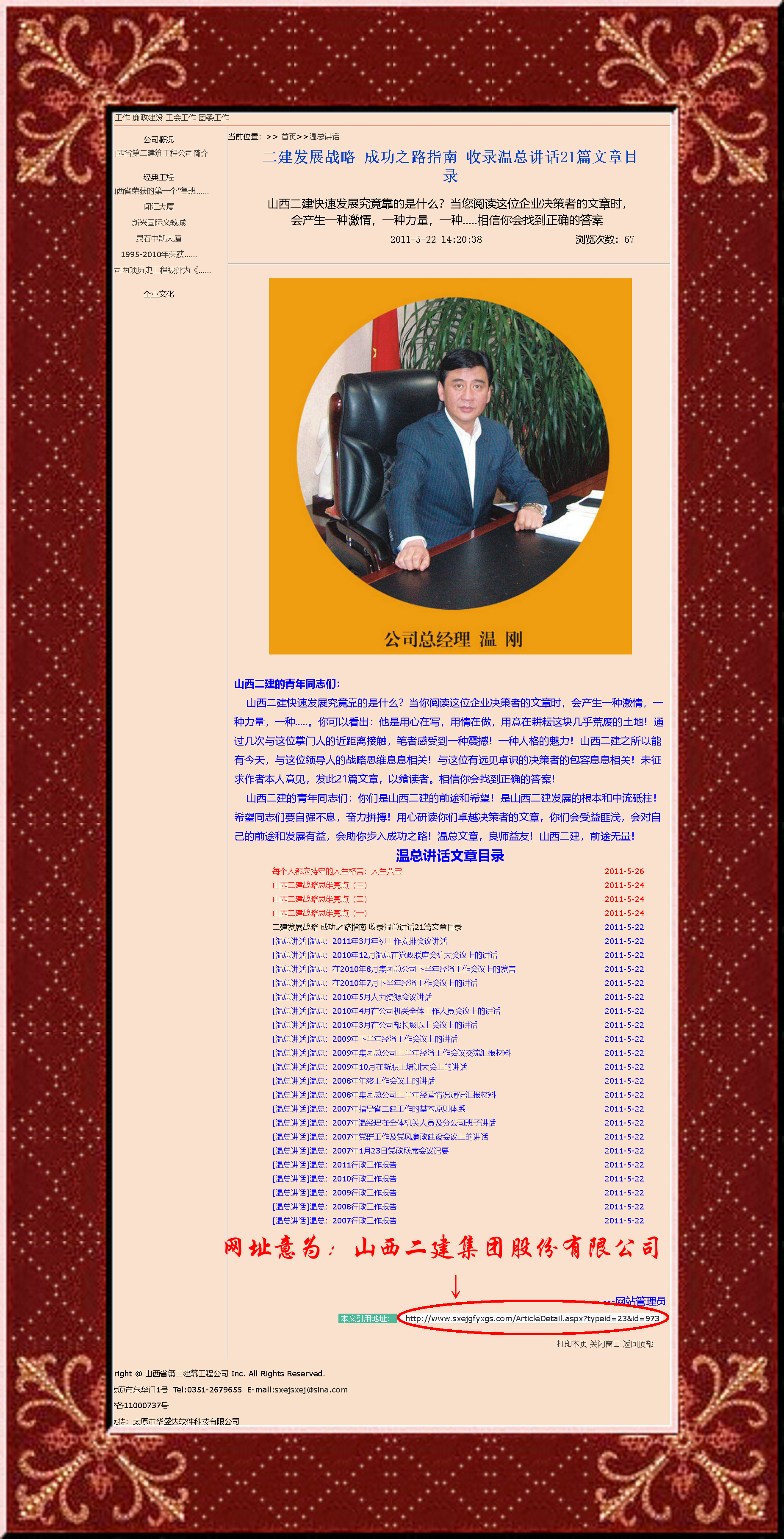 山西二建快速發(fā)展究竟靠的是什么?當你閱讀這位企業(yè)決策者的文章時,會產(chǎn)生一種激情,一種力量,一種.....。你可以看出:他是用心在寫,用情在做,用意在耕耘這塊幾乎荒廢的土地!通過幾次與這位掌門人的近距離接觸,筆者感受到一種震撼!一種人格的魅力!山西二建之所以能有今天,與這位領(lǐng)導人的戰(zhàn)略思維息息相關(guān)!與這位有遠見卓識的決策者的包容息息相關(guān)!未征求作者本人意見,發(fā)此21篇文章,以饗讀者。相信你會找到正確的答案!