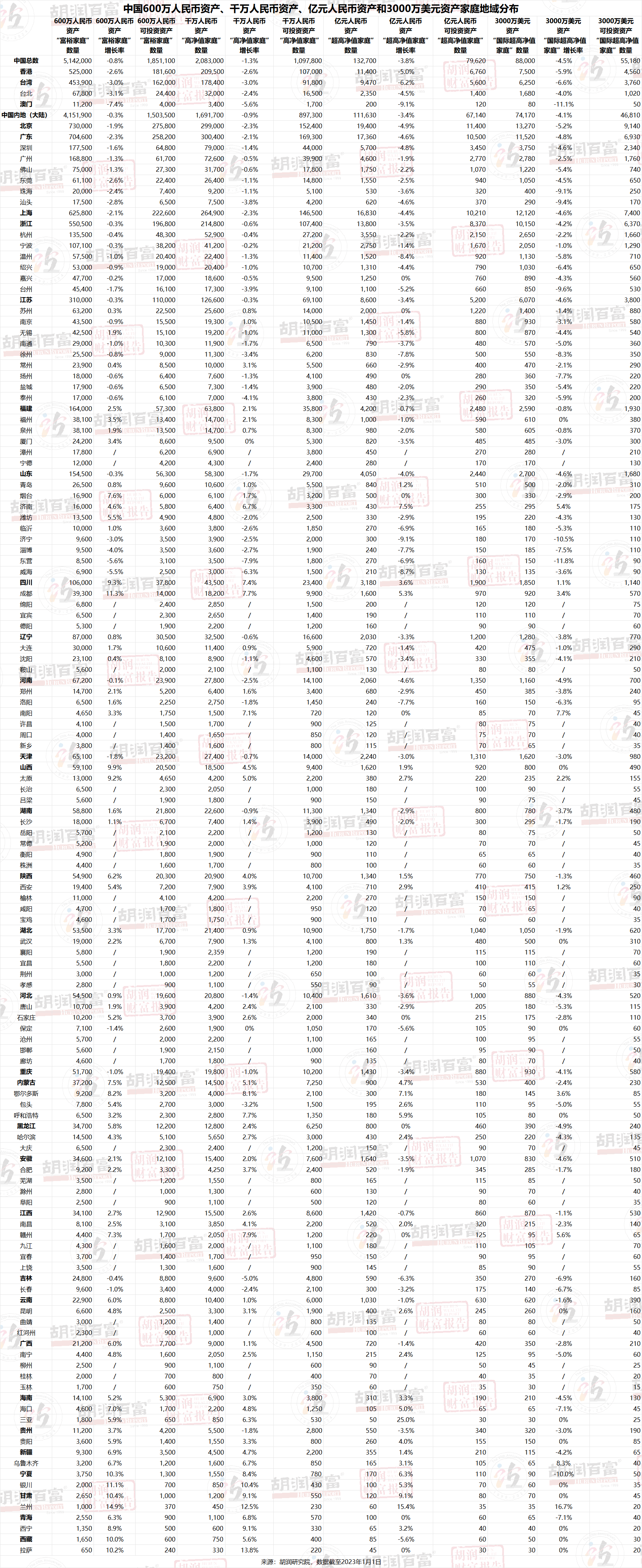 胡潤(rùn)研究院今日發(fā)布《2023胡潤(rùn)財(cái)富報(bào)告》(Hurun Wealth Report 2023)。報(bào)告揭示了目前中國(guó)財(cái)富家庭數(shù)量、地域分布情況以及人群畫(huà)像。這是胡潤(rùn)研究院連續(xù)第15年發(fā)布《胡潤(rùn)財(cái)富報(bào)告》。報(bào)告除了公布中國(guó)擁有600萬(wàn)人民幣、千萬(wàn)人民幣、億元人民幣和3000萬(wàn)美元總財(cái)富的家庭數(shù)量之外,也公布了擁有600萬(wàn)人民幣、千萬(wàn)人民幣、億元人民幣和3000萬(wàn)美元可投資資產(chǎn)的家庭數(shù)量。