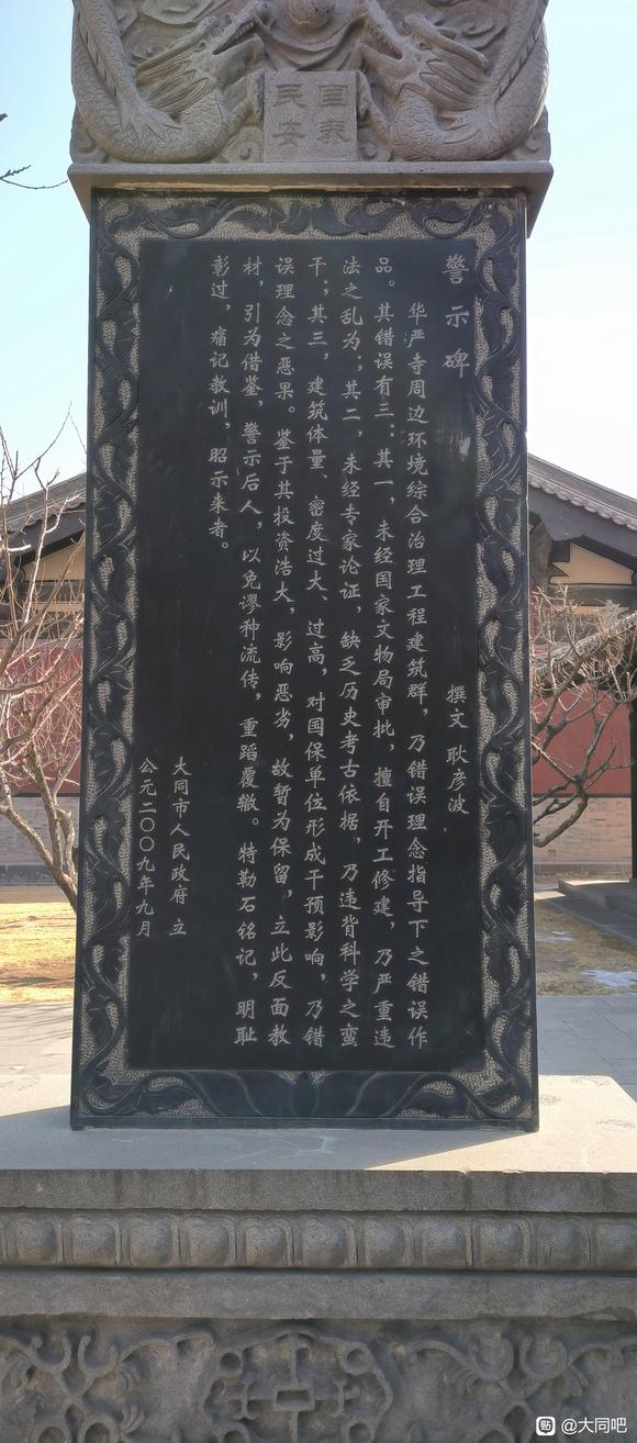 碑文主要內(nèi)容為:華嚴(yán)寺周邊環(huán)境綜合治理工程建筑群,乃錯(cuò)誤理念指導(dǎo)下之錯(cuò)誤作品。其錯(cuò)誤有三:其一,未經(jīng)國(guó)家文物局審批,擅自開工修建,乃嚴(yán)重違法之亂為;其二,未經(jīng)專家論證,缺乏歷史考古依據(jù),乃違背科學(xué)之蠻干;其三,建筑體量、密度過大、過高,對(duì)國(guó)保單位形成干預(yù)影響,乃錯(cuò)誤理念之惡果。鑒于其投資浩大,影響惡劣,故暫為保留,立此反面教材,引為借鑒,警示后人,以免謬種流傳,重蹈覆轍。特勒石銘記,明恥彰過,痛記敬訓(xùn),昭示來者。