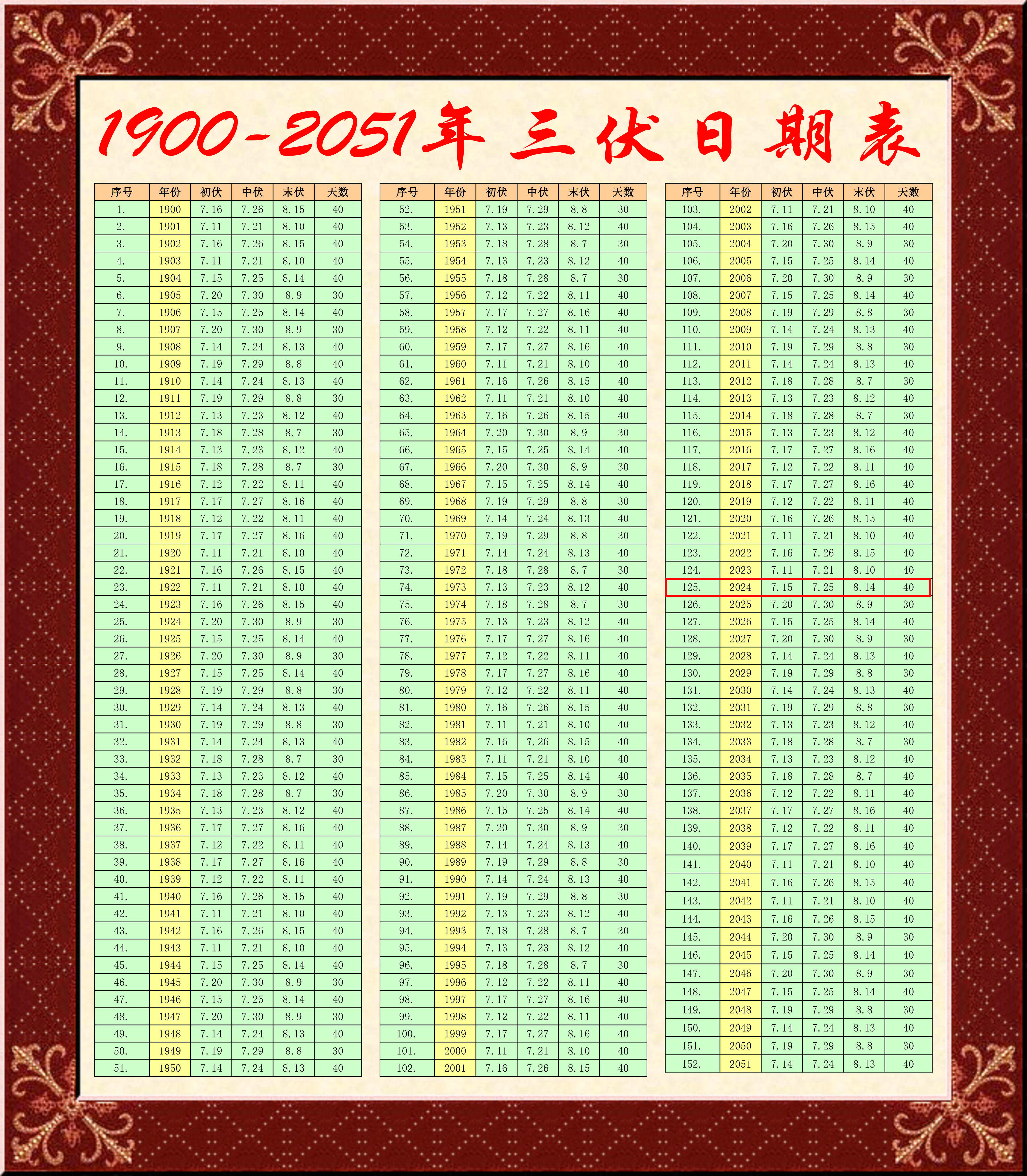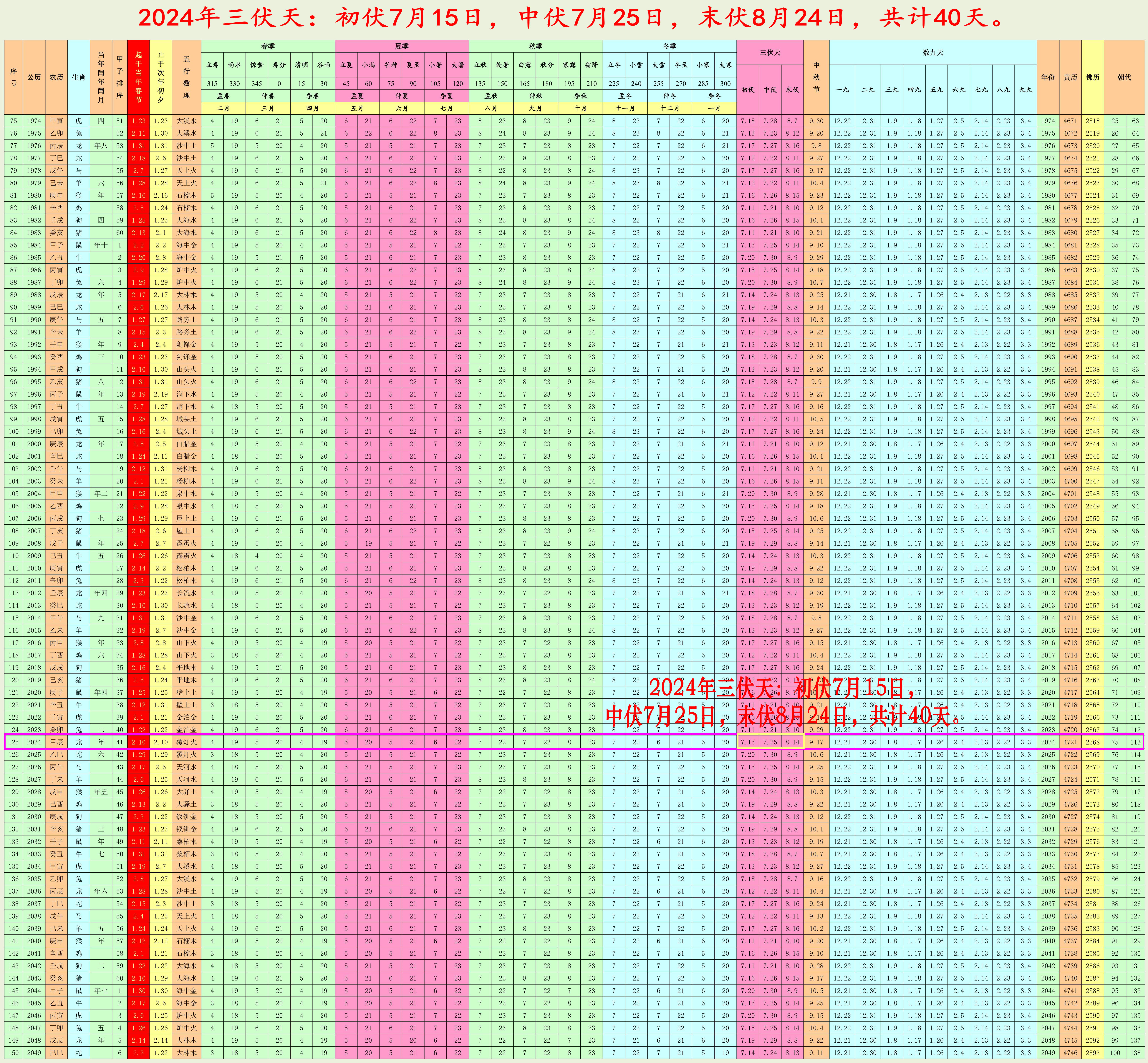 三、中伏起始日為28-30日,為10天;21-27日為20天。40年為一個轉(zhuǎn)換周期,其中10天年份11次,20天年份29次。初伏、末伏均為10天。