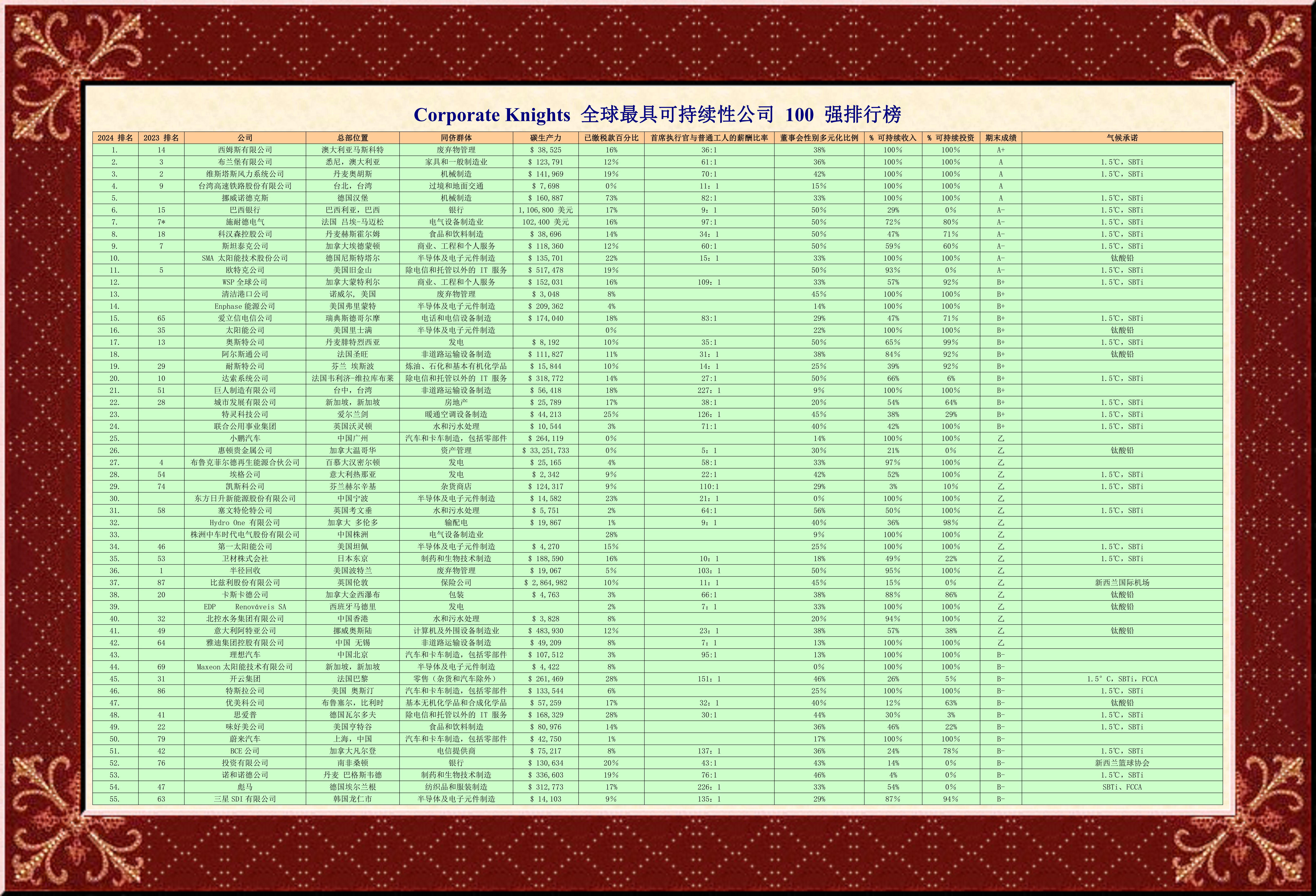 加拿大媒體和投資研究公司《企業(yè)爵士》(Corporate Knights)發(fā)布2024年“全球最佳可持續(xù)發(fā)展企業(yè)百強”(2024 Global 100:the world’s most sustainable companies)。企業(yè)領導者正將越來越多的收入用于加速綠色轉型的投資。在今年的100強中,排名靠前的公司將55%的投資分配給了可持續(xù)項目。