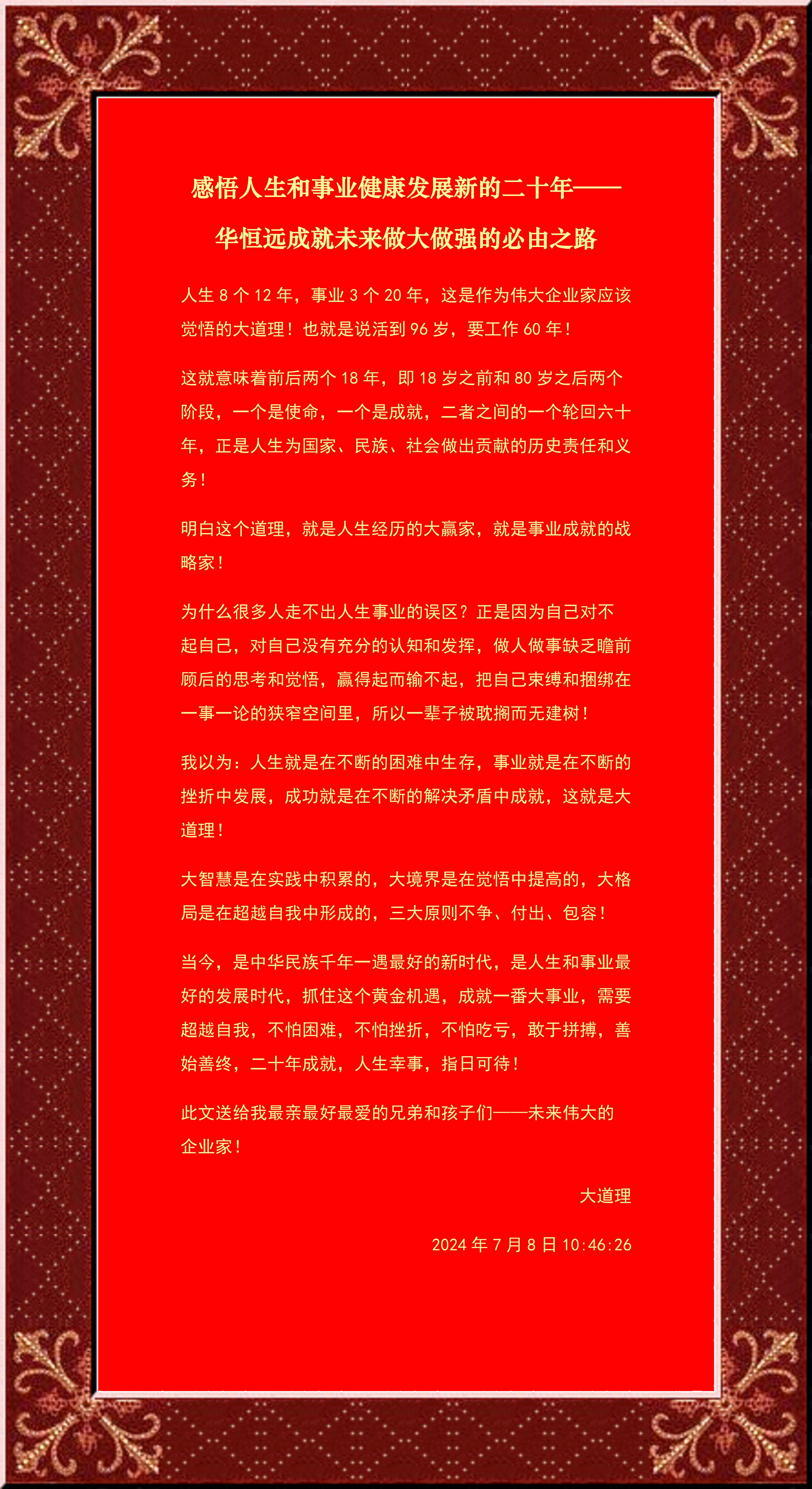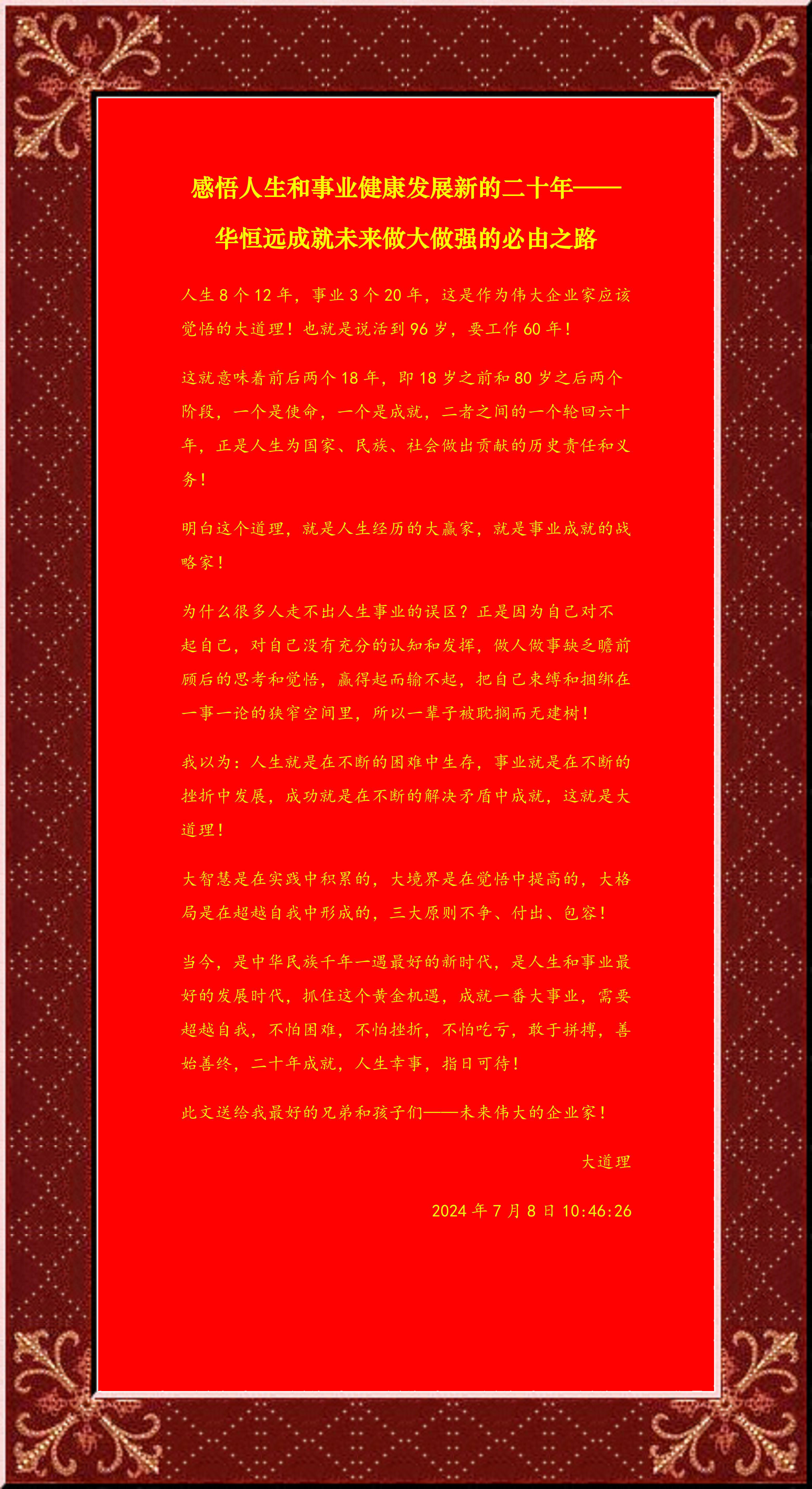 當(dāng)今,是中華民族千年一遇最好的新時(shí)代,是人生和事業(yè)最好的發(fā)展時(shí)代,抓住這個(gè)黃金機(jī)遇,成就一番大事業(yè),需要超越自我,不怕困難,不怕挫折,不怕吃虧,敢于拼搏,善始善終,二十年成就,人生幸事,指日可待!